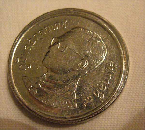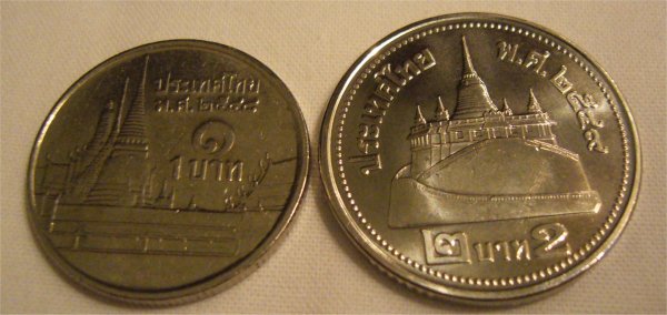 左は1Bahtコイン、右は2Bahtコインである。9月26日から流通が始まったとは話には聞いていたのであるが、手にしたのは当然の事ながら初めてである。ぱっと見ただけでは違いが判らない。色が違う訳ではないし、大きさも同じ位である。